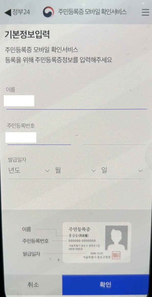 주민등록증 번호 및 발급 정보를 입력해 신청 완료 후 모바일 주민등록증이 활성화됩니다.
